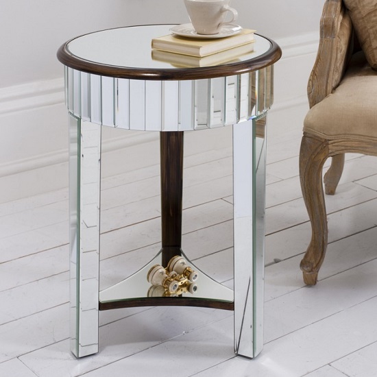 Harvard Mirrored Side Table Round With Bronze Base And Under Shelf adds Glamour in your Living Room Finish: All Mirror And Bronze Features: Harvard Mirrored Side Table With Bronze Accents And Under Shelf All Mirror And Bronze Stunning Side Table with bevelled mirror panels and Bronze finish Top and Undershelf has Glass It has a valuable Undershelf, can be used for placing routine handy items Round Shaped Side table Base and Body finished in Bronze With Mirror It can be used to place any decorative items like flower vase, photo frame Etc. Contemporary style Side Table adds glamour in your living room This beautiful Side table offers an Art-Deco appeal to any Interior Matching Range Coffee Table Also Available Available at an Affordable Price Dimension: Height: 65cm Width: 46. 5cm Depth: 46. 5cm